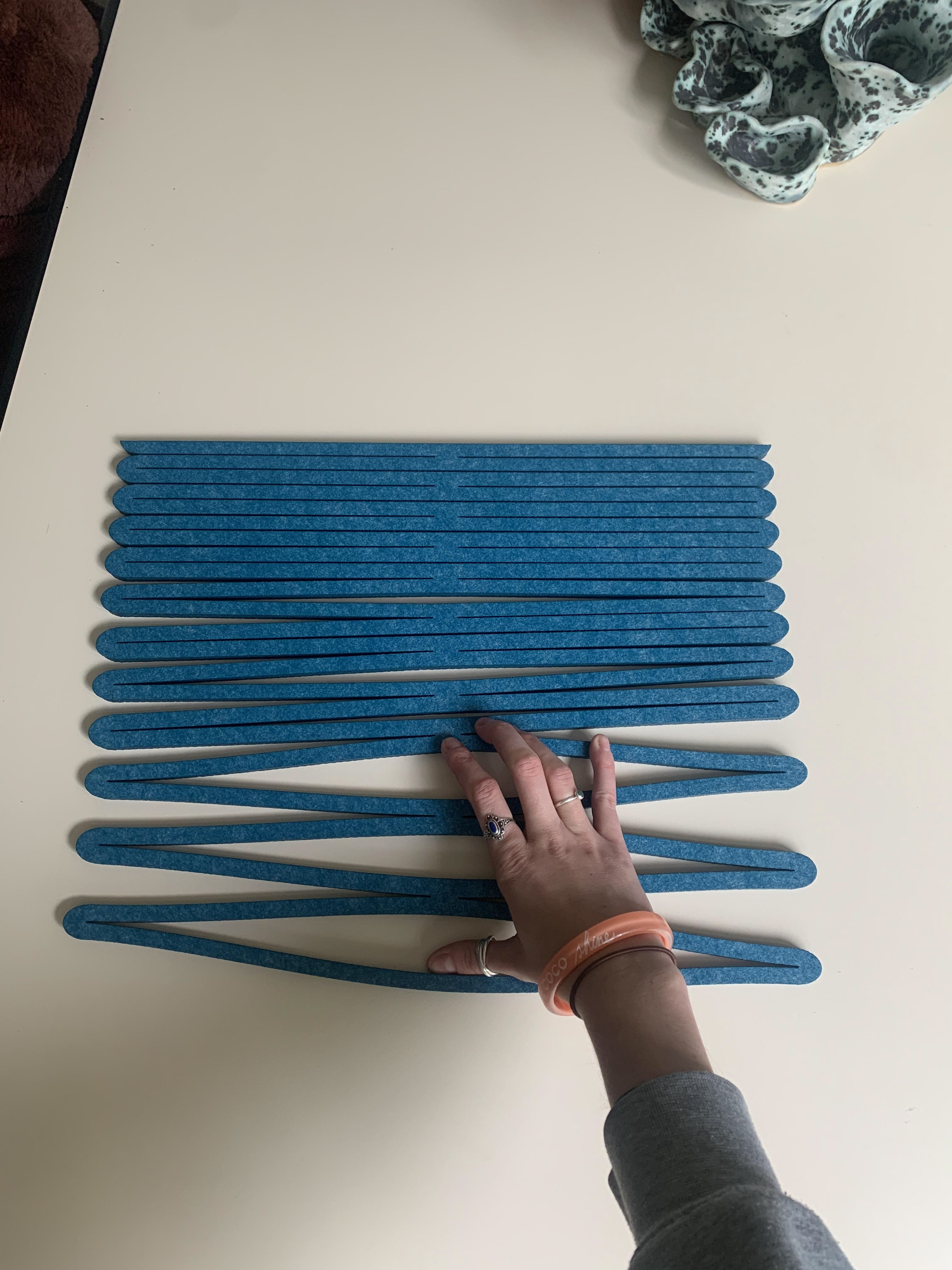 This project explores the boundaries of PET Felt as a material. We collaborated with the furniture company In-Zee, which produces various products with recycled PET (Polyethylene Terephthalate) Felt sheets. The material comes in thick and sturdy sheets, which inspired me to investigate its capacity for flexibility. Through laser cutting precise lines, I am able to make modular pieces that can be stretched and bent, playing with space and dimension.